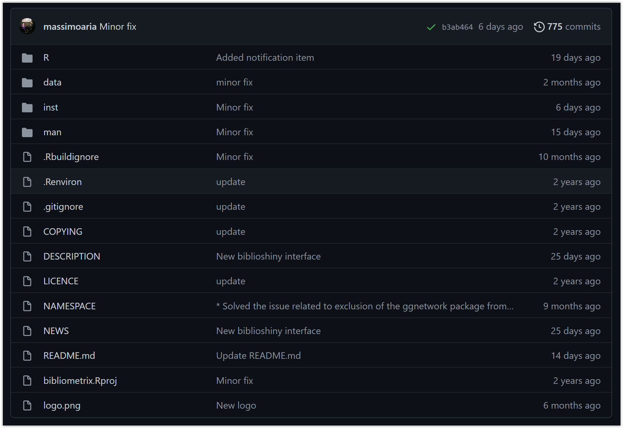 bibliometrix sources are published on the official "Comprehensive R Archive Network" (CRAN) and on GitHub, the world's leading software development platform.