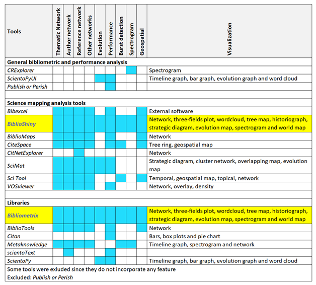 It has also become easier to access a large volume of bibliometric metadata, the field has known several methodological advances, and many different software tools for analyzing and visualizing bibliometric data were developed. The following table is provided by Muñoz et al. (2020). Their conclusion is: